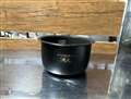 多賀一晃さん 内釜。2mm厚で「ダブル備長炭コート・熾火」との銘がある。釜自体は金属釜。 |