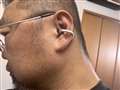 コヤマタカヒロさん 耳に取り付けたところ。横を通すのでメガネと干渉しない。 |