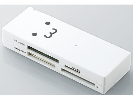 メモリースティック、SD、microSDが対応しているカードリーダーを探していたらコレにたどり着きました。 もう少し安い製品もありましたが・・・なんといってもデザインの意外性、かわいさですね・・・斬新です。 ★デザイン 文句なし。 見た目カードリーダーとは思えないデザインですが、しっかりカードリーダーです。 使用時には、顔の下がピカっと光ります。 まるでおへそが光っているようでまたかわいいです。 形状はやや縦長ですが、違和感なく使用できます。 ★機能性 ほぼ全てのメディアに対応しているので、不満はありません。 ケーブル収納も便利なのですが、いかんせんケーブル短すぎ・・・ PCと接続している際も本体が宙吊りになってしまい、見た目はあまりよくありません。 まぁ不満点としてはその位なので、許容範囲内です。 ★転送速度 特に低下する事もなく、快適に使用できています。 数枚のメディアの同時認識機能があればもっとよかったかもとは思います。 ★携帯性 小型なので持ち運びには適しているとは思います。 ただほとんど自宅使用なので、あまり小さすぎると無くしてしまいそうなので、ちょうどよい大きさなのかもしれません。 機能もさる事ながら、この製品のメリットはなんといってもデザインでしょう。 好き嫌いは分かれるとは思いますが、若年者層狙いのコンセプト(だと思う)は大いにアリだと思います。 機能もそこそこしっかりしているので、買ってよかったと思います。