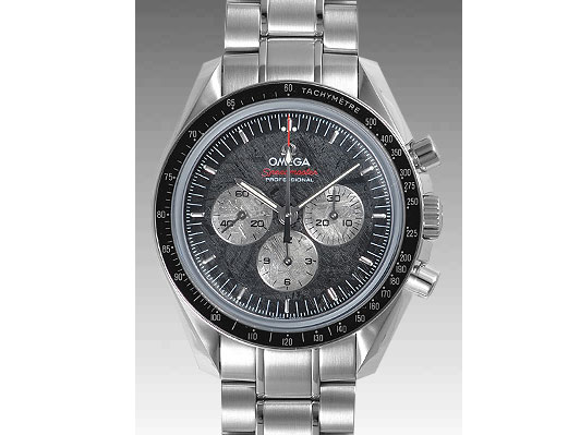 オメガのスピードマスタープロフェッショナル 311.30.42.30.99.001。 アメリカのアポロとソビエトのソユーズが宇宙でドッキングした1975年から35周年を記念した2010年発表モデル。 1975年にちなんで世界1975本限定。 メテオライトを採用した文字盤が最大の魅力。 天然石のオンリーワンな模様の特別感だけでなくブラックとインダイヤルのシルバーの2トーンカラーになっている点がさらなる魅力。 ブラックは見る角度によってはダークグレーにも見える。 クロノ針と「Speedmaster」のロゴに採用したレッドカラーが良いアクセントになっている。 裏蓋にはドッキングしたアポロとソユーズのレリーフがエングレービングされていて特別感がある。 ケースサイズは42mm。 手巻きCal.1861。 48時間パワーリザーブ 5気圧防水。
