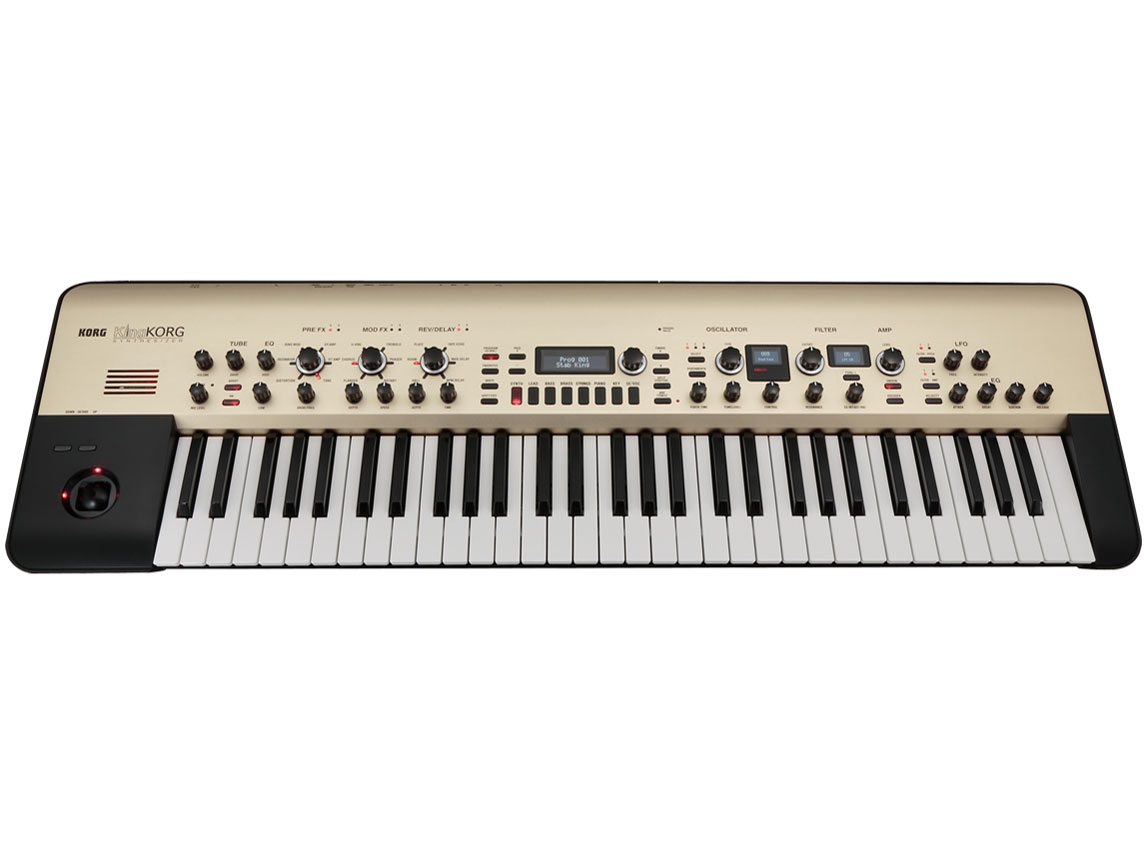 ライブ向きで買いやすい価格のバーチャルアナログシンセ。以前から気になっていたが、最近はリアルアナログでなければシンセでないというような風潮で、本機のようなデジタル技術によるバーチャルアナログはすっかり不人気になってしまったため購入には至らなかった。ついに生産完了となり、最後の在庫がショップによっては安価に販売されてる状態なので手に入れてみた。 【デザイン】 KROMEの筐体を流用しているが、厚く頑丈なアルミパネルの上に各種操作子が並べられており、シャンペンゴールドの色合いや梨地仕上げもあって、KRONOSに比べても高級感がかなりある。他社のフラッグシップと比べても見劣りしない。高級感は、ボディ後ろに向けてなだらかにカーブを描くアルミパネルの造型のためだろうか。 【サイズ・可搬性】 トップパネルを除く筐体はプラスチックで、ACアダプタということもあって軽い。重量のバランスも良い。 【音色・響き】 バーチャルアナログらしくない自然でオーガニックな音である。よく聞くと特にノコギリ波の高域に若干ザラついたところがある(エイリアシングノイズの関係だろうか)。Prophet-6やSub37といった本物のアナログシンセと並べて弾けばデジタルということがわかってしまうが、うるさいことを言わなければ、まず満足できるアナログ風サウンドと言える。 3基のオシレータが出す音は、用意されている波形数以上にバリエーション豊富である。波形は大きくわけてAnalog, DWGS, PCMの3種類がある。Analogは伝統的なノコギリ波、矩形波に加え、いわゆるSuperSAWや1基でシンクサウンドやクロスモジュレーションサウンドを出せたり、1基で2OPのFM音源(キャリア/モジュレータの周波数比は整数倍のみ0.5倍〜32倍まで任意設定)を実現できるオシレータタイプが3種類あったりして、他のモデルにはない強力なタイプが多数用意されている。DWGSはいわゆるウェーブテーブル系のギラギラした音作り用、PCMはオマケで、本機が唯一の鍵盤というような学園祭バンド構成でもそれなりにライブをできるようにするため、ピアノやオルガン、ブラス、ストリングス、クワイヤなどの定番波形が少数用意されている。 フィルタータイプは豊富に用意されていて、無機的なKINGフィルター、moogのラダーフィルター、Prophet5のCEMフィルタ、Oberheimのステートバリアブルフィルタ、荒々しいMS20フィルタが各2〜3種類ずつある。同じ波形でもフィルタータイプを変えることで、音がガラリと変わって楽しい。 簡単なマトリクスモジュレーションが可能で、変調元、変調先、変調深さを6種類設定できる。エフェクトが3系統あり、効果は並である。真空管回路は有用である。他のデジタルシンセよりは太いが、リアルアナログシンセに比べてやや細い音が、真空管回路を通すとリアルアナログ並みに太くなる。 【音色の多さ】 プリセット200音色の多くは、過去のヒット曲の音色をコピーしたもので、イメージがわきやすい。また同社のM1のプリセットを真似た定番音色もある。201〜300番の音色は未定義で、ユーザーが白紙から作っていくことになる。 【タッチの良さ】 もともとKORGのシンセ鍵盤はあまり良くはない。KRONOS61はフラッグシップでありながら安っぽいタッチでがっかりさせられる。本機のタッチはそれ以上ではないが、一応セミウェイテッドであり、それほど悪くもない。アフタータッチは無い。 【作りの良さ】 前述したようにアルミによるトップパネルの質感が非常に高い。とても10万円前後の機種とは思えない。 【機能性】 手弾きに特化したシンプルでストイックな作りであり、オールインワンの多機能を求める人には向かない。あくまでキーボードプレイヤーのためのシンセである。アフタータッチがないことと、モノフォニック設定時にポルタメントのレガートモードがないのが残念である。パネルの文字は見やすく、各ツマミやスイッチは十分な大きさがあって操作しやすいから、誤操作はあまりしないだろう。 【操作性】 音作りの機能の多くは有機ELディスプレイを見ながらロータリーエンコーダで設定する必要があり、パネル上で操作できるのはフィルターカットオフなど操作頻度が高い一部である。少ないパラメータで効果的な音作りができ、パラメータは膨大でないから、あまり困らない。 【総評】 用途が明快で買ってすぐ使える優秀なプリセット、簡易FM音源としても使える奥の深い音作り機能、オーガニックで暖かく魅力的な出音、高級感のある造型など、中国製ではあるが日本ブランド製品ならではのコストパフォーマンスが高い機種である。King KORGというオヤジギャグのような名称、全パラメータが露出していないこと、KROME筐体による派生モデル感、リアルアナログの流行によるバーチャルアナログ軽視風潮、2EG/2LFOにより複雑な時間変化をもつパッドは作りづらい(最近はそういうのは流行らないが)、などにより、あまり人気が出なかったようだが、優れた1台であると思う