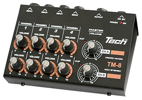 同社製品MICRO MIXER TM-4のch数を倍の8chにしたモデル。4系統の音源×2chでモノラル2ch出力が可能になってます。コンパクトなサイズで携行性が良く乾電池で動きますので携行性も優れているかと。