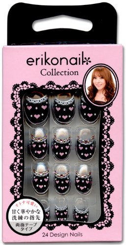 エリコネイルコレクションはとても綺麗なチップが 多く、こちらも良さそうだったので購入しました。 24枚入りで、付属の両面タイプで爪に装着するだけで 自分で塗るよりも手っ取り早く且つ綺麗な爪が一瞬で 出来上がり、自分の爪を傷める心配も無く満足しています。 爪の半分より先の方にいろいろとデザインとカラーがある タイプで、黒地にピンクの細かなハート柄がキュートで 24枚の内6枚はピンクやシルバーのラインストーン付き なので結構華やかでインパクトある爪になります。 価格はそこそこしますが、繰り返し使えてとても良い商品 だと思います。 これぐらいインパクトあるネイルを自分で作るにはいろいろと 大変ですが、このチップなら粘着テープでチップを取り付ける だけですぐに仕上がるので、お出かけ前にささっと仕上がって 便利でした。