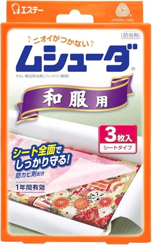 防虫効果が一年間効き目があり、シートタイプなので和服タンスの中に使っています。薄手のシートタイプなので、場所も気にせず使えることと、臭いが着物に付かないのがよいです。今までは、ナフタリンを使用していましたが、ニオイがきつく刺激が強かったのですが、このシートにしてから便利になって使いやすいです。