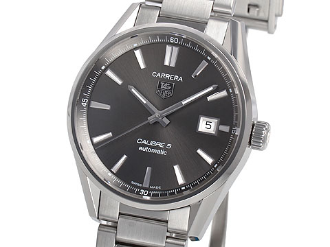 タグ・ホイヤー カレラ WAR211C.BA0782。 シンプルな3針+日付表示。 アントラサイトグレーの文字盤はクールで落ち着いた印象。 サンレイ仕上げで中心から放射状にできる光の輝きが綺麗。 さらに中央から同心円状にラウンドサークルの模様が施されており(アジュラージュ加工)光の当たり方により立体感に変化が生まれるのも本モデルの大きな特徴。 ステンレススティールのケースはサテン仕上げとポリッシュ仕上げの使い分けで美しい仕上がり。 ケース径は39mmと丁度良いサイズ感。 ケース厚は12.27mm。 ステンレススティールのブレスレットは薄めでソフトで滑らかな装着感。 躍動感のあるスポーティーなモデルだがシンプルな3針デイトで落ち着いたグレー文字盤でスーツスタイルにも合わせやすい。 サファイアガラスのシースルーバックからはキャリバー5を鑑賞できる。 パワーリザーブは38時間。 2日間に満たず最近の腕時計と比較すると短め。 10気圧防水で実用的。 390,500円