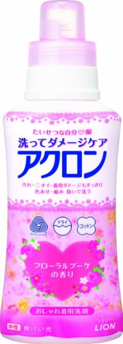 アクロン独自の高浸透ダメージケア組成の働きで、色あせ・縮みなどの洗濯ダメージを防ぎ、一日着たあとの伸び・ヨレなどの着用ダメージもケアして整えます。泡切れが早く、何度もすすぐ必要がないから衣類へのダメージをさらに軽減中性・無蛍光心華やぐフローラルブーケの香り。ピンクローズ、ミュゲ、ジャスミンなどをミックスした定番の香りです。と書いていましたが香りが想像つきませんでした。自分なりの言葉で表現すると爽やかで少し甘い香りという感じでしたね。ダメージ補修とかは正直わからなかったんですがすすぎは確かに一度でいいと思いますよ。