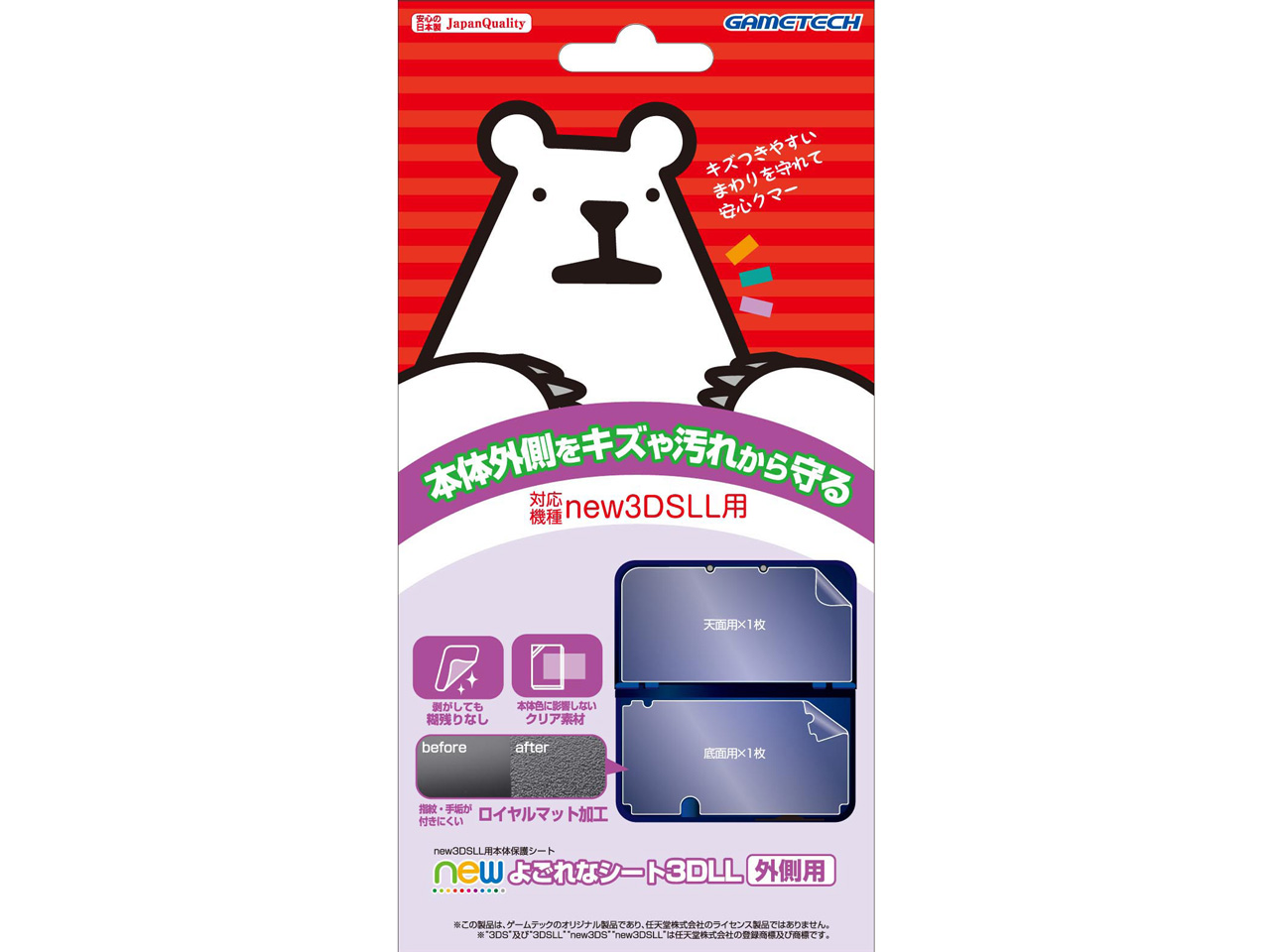new よごれなシート3DLL 外側用は、new 3DSLL本体の天面と底面をすりキズや汚れから守る保護シートです。 シート表面はロイヤルマット加工を施してあって、指紋や手垢などの汚れがつきにくく、サラサラな手ざわりなので、とても使っていて気持ちがいいです。 本体の外側の細かい部分まで守れるところがとてもよかったです。 限定版の本体をきれいに保存しておきたい時に重宝しました。 new 3DSLL本体にしっかりと貼り付いて、剥がしても糊残りしないので、貼るのを失敗知った時にとてもよかったです。