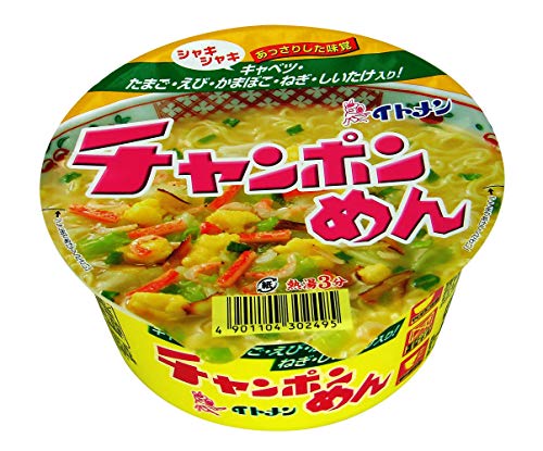 イトメンのチャンポン麺をカップ麺で食べることができ大変便利です。 私はイトメンの麺は少し頼りなく苦手な感じなのですが、スープが大変美味しく、飲むとホッとしています。 ご飯とも合うしとても美味しいです。 おにぎりなどと合わせて食べるといいと思いました。スープ代わりにして飲むのもありだと思います。 原材料:油揚げめん(小麦粉(国内製造)、植物油脂、食塩)、添付調味料(食塩、小麦粉、糖類、粉末油脂、粉末蝦醤、しいたけエキス、たん白加水分解物、ねぎ、香辛料、野菜エキス、オニオンパウダー、ガーリックパウダー)、かやく(キャベツ、卵、えび、かまぼこ、ねぎ、しいたけ、砂糖、食塩)/加工でん粉、調味料(アミノ酸等)、乳化剤、かんすい、カロチノイド色素、酸味料、ソルビトール、グリセリン、酸化防止剤(ビタミンE、ローズマリー抽出物)、香料、紅麹色素、リン酸ナトリウム、(一部に小麦・卵・乳成分・えび・大豆・鶏肉・豚肉を含む) 内容量:84g×12 カロリー:368Kcal