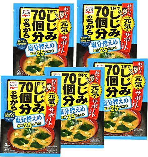 先行レビューの『1杯でしじみ70個分のちから みそ汁 3食入』に続いて、 塩分控えめの本商品をレビュー致します。 本品は『1杯でしじみ70個分のちから みそ汁 3食入』と比べ、 1食当たりのナトリウムが25%カットされています。 【スープ】 米味噌、しじみエキス、あさりエキスの味がしっかりと出ています。 美味しいです。 夏以外では塩分控えめを選択しようかな。 【具材】 ワカメが元に戻るまで少々時間が掛かります。 しじみは小さいです。油断してるとそのまま飲み込んでしまいます(笑) 【パッケージ】 発酵オルニチンについて学ぶことが出来ました。 表面の右下に次の記載があります。 ※ 本商品は、乳酸菌の発酵で生成したオルニチンを併用しているため、 酸味があるのが特徴です。 【総評】 「しじみのおいしさをより一層味わっていただける一杯に仕立て直しました。」 とパッケージ裏面にあります。 ( ̄▽ ̄;) 以前はどんな仕上がりだったのだろう・・ 宍道湖のしじみを使用した御味噌汁が恋しくなりました。 熱中症予防を兼ねて飲むのでしたら、 個人的には塩分控えめではない『1杯でしじみ70個分のちから みそ汁 』の方が良いかなと感じました。 【アレルギー注意】 えび、かにの生息域で採取したわかめを使用されています。 [参照] 永谷園 1杯でしじみ70個分のちから みそ汁 3食 ×10個のレビュー・評価 レビュアー:Tio Plato しじみがとっても小さいですが、手軽に味わうことが出来ます。 http://s.kakaku.com/review/K0000806017/ReviewCD=970845/