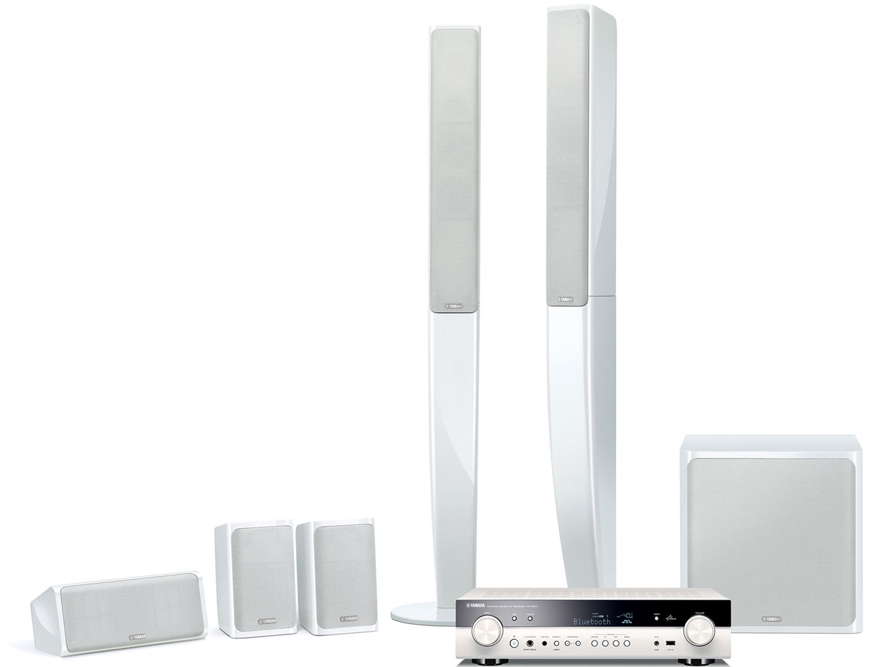 - 435(幅)×111(高さ、脚部含む)×327(奥行)mmの薄型フォルムのAVレシーバーや、トールボーイスピーカーを採用した5.1ch「ホームシアターシステム」。