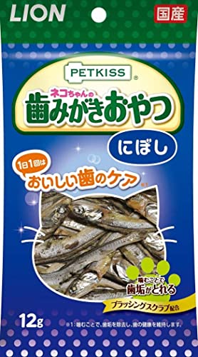 【栄養バランス】 おやつなので、栄養バランスは気にしませんが、にぼしは一般的に猫にはあまりよくないとされているので、与えすぎは禁物かと思います。 【食いつき】 全然食べません。ちぎってドライフードに混ぜてもよけて食べません。 【香り】 普通の煮干しの香りです。 【保存期間】 未開封で1年のようです。開封後は冷蔵庫で保存し、早めにお与えくださいとありますが、普通のにぼしなみに保管は効くと思われます。 【総評】 保護した子猫の口臭がひどい(口内炎等はなし)ので、歯磨きがわりに与えてみましたが、全然食べてくれません。 2歳の成猫も同様でした。 ためしに自分が食べてみましたが、味、香り、食感とも普通のにぼしです。 ブラッシングスクラブ配合ということですが、そういうものは感じません。 ちなみに、現在はペットキッス ネコちゃんの歯みがきおやつ にぼしに商品名とパッケージが変わっているようです(内容量・成分は変わらず)。