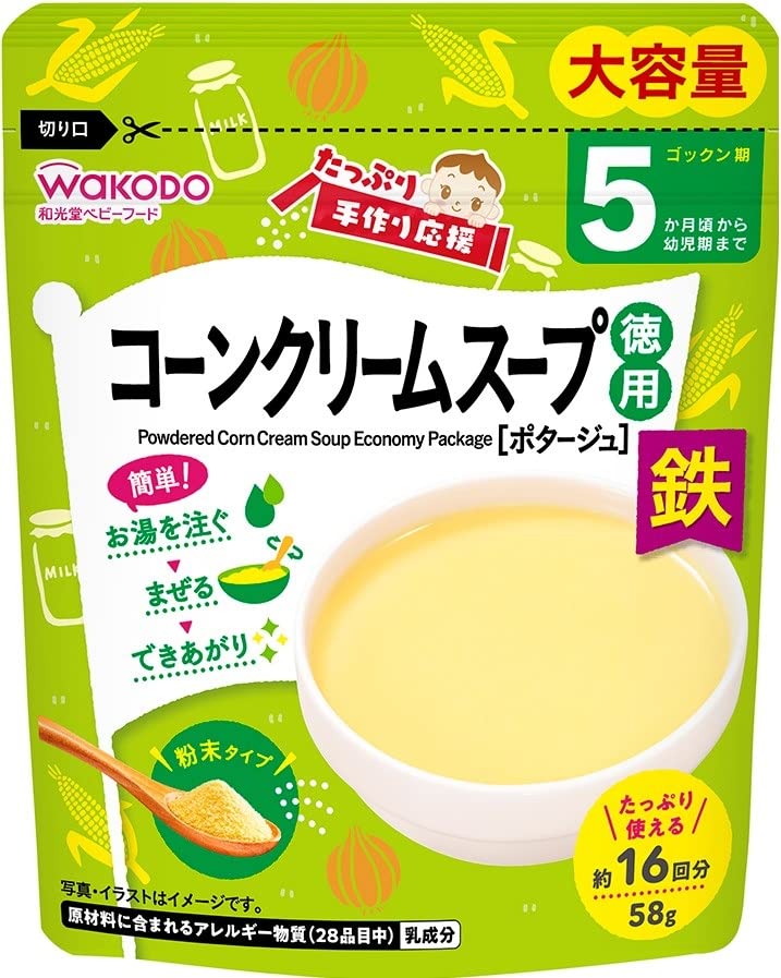 【総評】 おおよそ16回分入っていて重さは58gある。 お徳用ですね、1回分で20円もしません。 1食分が20円以下ってものすごいコスパ。 適用年齢は、5ヶ月頃〜幼児期まで。 乳成分は入っていますが、卵、小麦、えび、かに・・は使っていません。 なにより、塩分が少ないのがいいですね。むろん乳児用規格適用です。 北海道産のスイートコーンを使用だそうです。 まあ、乳幼児用に産地までこだわるのもどうかと思うけど。 乳幼児は北海道なんて知りませんからね。こだわるのは大人だけ。 大人が味見してみましたけど、はっきりいって味はしません。 大人からしてみたら塩分なんて入ってないみたいな。 大人用の味付けなんて毛頭しないってことですね。 子供はおいしいのかどうか、よろこんで食べてはいますけど。 普通なんでもおいしそうに食べますけどね。 栄養成分 ●エネルギー:14kcal ●タンパク質:0.5g ●脂質:0.2g ●炭水化物:2.6g ●食塩相当量:0.1g