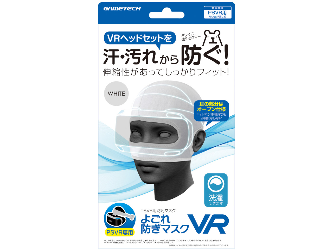 見たお店で選択肢がなかったので、もっと色やメーカーがあったことにショックを受けています。 白じゃなくて黒や紺がよかった。 【デザイン】 普通。 メタルギアのザコ兵みたい。 【使用感】 これだけ装着をしても今の時期はエアコンを切ると汗が出てくるし、蒸れます。 恥ずかしいですが、装着した画像を見ていただければわかります。 頭回り53センチです。 目出しの部分は問題ないのですが、鼻との距離が合わず、調整しない状態だと鼻の部分は口を塞いでくれます。 調整して上に持ってくると、耳たぶが上に引き上げられて、プレイしている間に痛くなってきます。 また、縫合形状からつむじの辺りに余りが出てしまうので、これがヘッドを装着するときに当たるので私たちには位置が悪いです。 ヘッドをつけると、鼻の部分が長いので塞がれてしまい、調整で布を上に寄せて呼吸を確保していますが、それでもプレイ中にどんどんずれてきて鼻呼吸がしづらくなります。 男性にはちょうどいいぐらいみたいですが、私にはちょっと大きいみたいです。 【耐久性】 ポリエステル100%素材です。 触った素材の感じは伸縮性があり、さらっと感がありますが、通気性に問題があるなと思われます。 とても薄い水着素材のような感じなので、洗濯は簡単です。 ただ、家で洗えますが品質表示通りに洗うとあっという間に伸びきっちゃうと思うので、ちゃんとネットに入れるか、手洗いの方がいいように思えます。 消耗品なので10年使う気はありませんが、洗濯機で5回洗濯で怪しいところです。 面倒なら割高ですけど使い捨てを選ぶのがいいかと思います。 【総評】 VR自体が超過熱しているわけでもなく、ソフトも全然出ていないので、店舗での取り扱いが多種類ではないようです。 こちらも購入時の混雑が凄くてすっかり忘れていました。 店員さんもモーションコントローラーはおすすめしてくれましたけど、ヘッドマスクはお勧めしてくれなかったのですっかり買い忘れ。 しょうがないので、家の近くの大型店に行ってどのお店も2択だったためにこちらにしましたが、素材としては値段相応かもしれませんね。 また、近所の店舗では在庫もない場所があるので、売る気がない人なら要らないかもしれません。 冬なら薄手の目だし帽を買ったほうがマシでしょう。 とりあえず買う分には問題ないです。