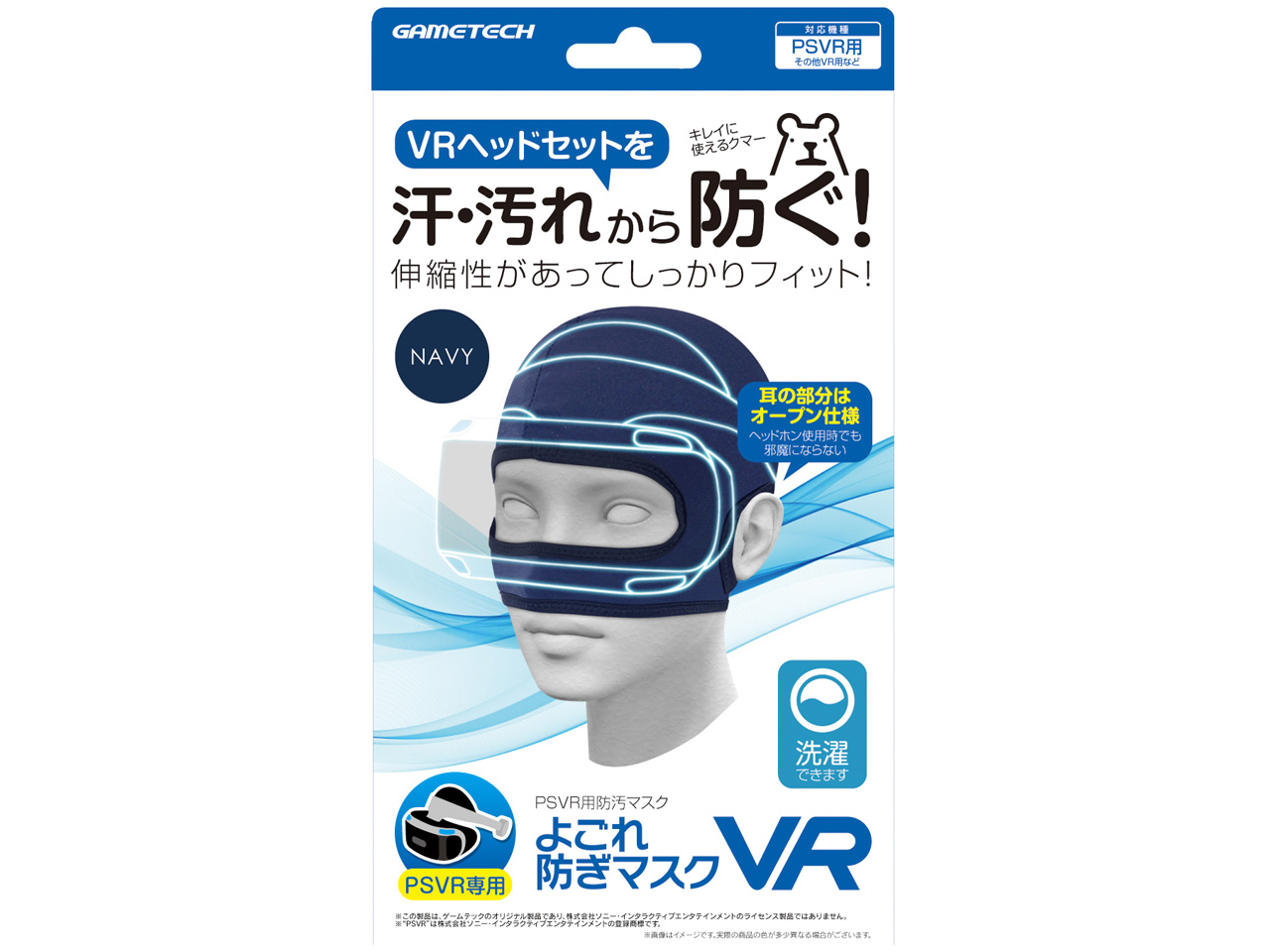 見たお店で選択肢がなかったので、もっと色やメーカーがあったことにショックを受けています。 白じゃなくて黒や紺がよかった。 【デザイン】 普通。 メタルギアのザコ兵みたい。 【使用感】 これだけ装着をしても今の時期はエアコンを切ると汗が出てくるし、蒸れます。 恥ずかしいですが、装着した画像を見ていただければわかります。 頭回り53センチです。 目出しの部分は問題ないのですが、鼻との距離が合わず、調整しない状態だと鼻の部分は口を塞いでくれます。 調整して上に持ってくると、耳たぶが上に引き上げられて、プレイしている間に痛くなってきます。 また、縫合形状からつむじの辺りに余りが出てしまうので、これがヘッドを装着するときに当たるので私たちには位置が悪いです。 ヘッドをつけると、鼻の部分が長いので塞がれてしまい、調整で布を上に寄せて呼吸を確保していますが、それでもプレイ中にどんどんずれてきて鼻呼吸がしづらくなります。 男性にはちょうどいいぐらいみたいですが、私にはちょっと大きいみたいです。 【耐久性】 ポリエステル100%素材です。 触った素材の感じは伸縮性があり、さらっと感がありますが、通気性に問題があるなと思われます。 とても薄い水着素材のような感じなので、洗濯は簡単です。 ただ、家で洗えますが品質表示通りに洗うとあっという間に伸びきっちゃうと思うので、ちゃんとネットに入れるか、手洗いの方がいいように思えます。 消耗品なので10年使う気はありませんが、洗濯機で5回洗濯で怪しいところです。 面倒なら割高ですけど使い捨てを選ぶのがいいかと思います。 【総評】 VR自体が超過熱しているわけでもなく、ソフトも全然出ていないので、店舗での取り扱いが多種類ではないようです。 こちらも購入時の混雑が凄くてすっかり忘れていました。 店員さんもモーションコントローラーはおすすめしてくれましたけど、ヘッドマスクはお勧めしてくれなかったのですっかり買い忘れ。 しょうがないので、家の近くの大型店に行ってどのお店も2択だったためにこちらにしましたが、素材としては値段相応かもしれませんね。 また、近所の店舗では在庫もない場所があるので、売る気がない人なら要らないかもしれません。 冬なら薄手の目だし帽を買ったほうがマシでしょう。 とりあえず買う分には問題ないです。