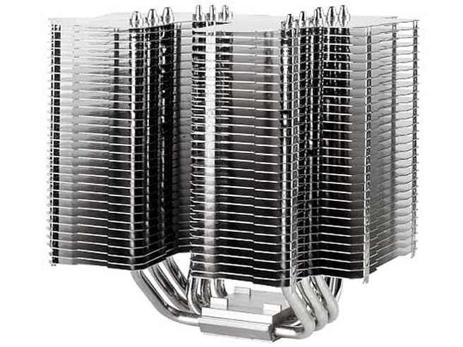 - アルミニウムフィンと6mm径のヒートパイプ6本を繋いだ銅製のベースを組み合わせている。