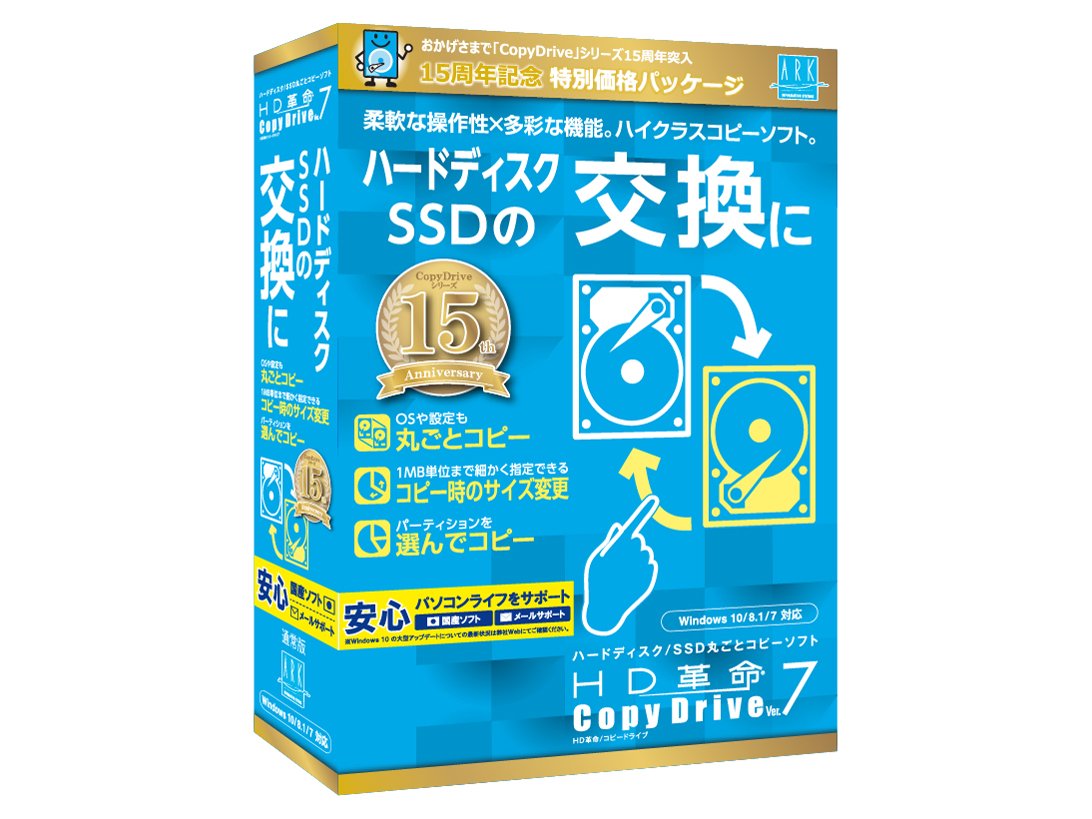 Ver4から定期的に購入。 こちらはWindows10(Ver1809)対応です。 【機能性】 以前のものよりも値段は安くなりましたが、大まかな機能は変わりません。 【使いやすさ】 単純に購入したSSDにクローンしたい場合は、操作は単純です。 下手にパーティション操作してしまうと、起動上の問題起こるかもしれません。 【安定性】 Windows10ではVer変更の都度、安定性変わるのでソフトよりもMSさん次第。 Windows 10 May 2019 Updateからの利用では、CopyDrive.8が望ましいのでしょうけど、このソフトVer7.0.3でしたら対応しているようです。 詳細は下記URLサポートページを確認してください。 https://www.ark-kakumei.jp/windows10rs6 【軽快性】 軽いソフトなので、余程のことが無いと思いと感じないのでは? 【サポート】 サポートを受ける際には、事前にユーザー登録してください。 対応パッチのダウンロードされる際、登録したパスワードなど大事なので、パッケージ版を購入された際には、パスワード等の登録した内容は、別途記入しパッケージの箱に入れて保管が望ましいですね。 【マニュアル】 使い慣れているので殆ど読んでいませんが、パッケージ版にはマニュアル付いています。 【総評】 SSDアライメント調整は別のソフト利用となりますが、容量小さいものや大きいSSDに、システムドライブや他のドライブクローン作製用途には、こちらが楽なので重宝しています。