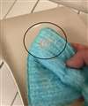 | スポンジ本体・パッケージ表面・パッケージ裏面 | パッケージ裏面拡大 | 固めの縮れた繊維が密集しています。 表面はストライプ状の凸凹になっています。 | 円を描くように風呂椅子をこすると 汚れがゴッソリとれました。 |