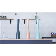 まっすぐ伸びたしなやかなフォルムの、高さ80cmの加湿器。PTCヒーターと超音波のハイブリッド方式を採用し、加湿効率を大幅にアップさせた。背の高さとハイブリッド方式により、床濡れの問題も軽減する。