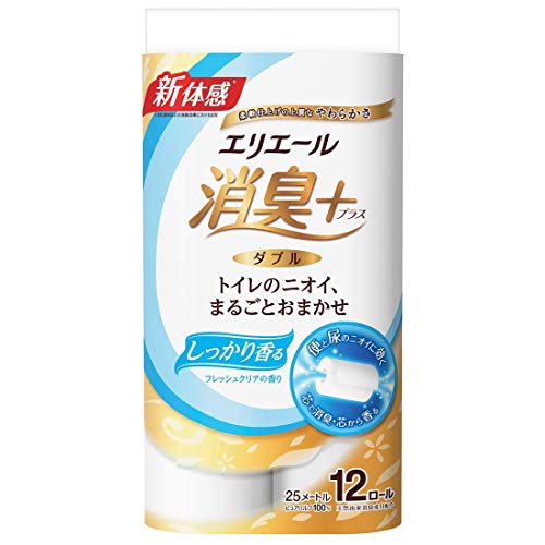 エリエールから出ているトイレットペーパーの中でも消臭に 重点を置いたこちらの商品を購入しました。 ダブルで12ロールの価格としては格安ではないですが高くも なくて普通に買いやすい価格だと思います。 ピュアパルプ100%なので純白でペーパーの中でもとても綺麗な 色合いです。 ペーパーの肌触りはとても優しく、ダブルなので適度な厚みがあり ふんわり感もあり、シャワートイレで使っても紙がボロボロになった りせずに普通に使えています。 消臭に付いては、このペーパーの芯にしっかり石鹸のような香りが 付いているので、トイレに入った瞬間香りがするのですが、香りは やや強めで清涼感が少しあるのですが、良い香りがしっかりするので 嫌なトイレの香りを消す分にはちょうど良いと思いました。 ただ、最近は香りが強めなのでもう少し弱くても良いかなとやや思って います。 消臭にこだわりがある方も無い方もどちらが使っても紙質としては とても使いやすくて質が良いと思います。