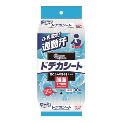 【総評】 メンズ用の汗ふきシート。一辺が30cmもあるシートです。 でかいけど使ってて破けることはありません。 顔が全部隠れますよ。「ドデカシート」と書いてあります。 顔はもちろんボディにだって使えるけど。 ま、出先では顔だけにしときましょう、首筋とかも。 さらに腕ぐらいまでならいいけど。 拭いたときのひんやり感は気持ちいいです。 真夏の暑−−−い日には必須ですよね。 顔と腕の汗取りに重宝しますよ。 ビジネスマン必携のアイテムでしょ。