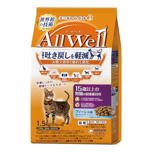 AllWell 15歳以上の腎臓の健康維持用 フィッシュ味 挽き小魚とささみフリーズドライパウダー入り 1.5kg(375gx4袋)