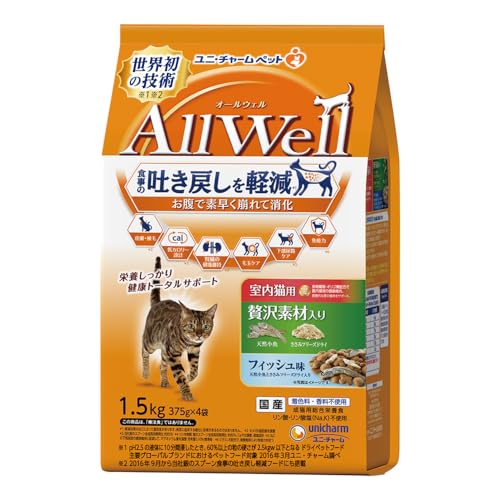 AllWell 室内猫用 贅沢素材入り フィッシュ味 天然小魚とささみフリーズドライ入り 1.5kg(375gx4袋)