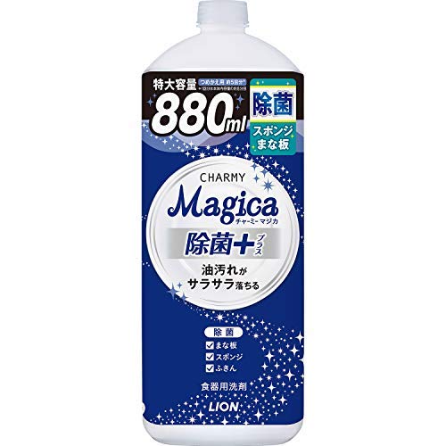 チャーミーマジカから出ているこちらの商品をドラッグストアで 見つけたので購入しました。 本体を持っているのでこちらの詰め替え用の大容量を購入しました が、この詰め替え用は約5回分も入っていて価格が安かったので詰め 替えタイプの洗剤の中でもお買い得だと思いました。 880mlなのでかなり重さはありますが、台所の下にストックする分に は容量があり、何度も洗剤を買いに行かなくても済むので便利でした。 香りはフレッシュシトラスグリーンの香りで、甘さのあまりないすっ きりとした香りなので、フルーツや花の甘い香りの洗剤があまり好き でない方もこれなら使いやすい香りだと思います。 よく揚げ物をするのですが、そんなに洗剤の量をたっぷり使わなくて も油汚れもすっきりと落ち、結構鍋や食器を沢山洗っても冬場でも手 が荒れることが滅多にないので使いやすいです。 また、まな板やスポンジの除菌もこれで出来るので、まな板やスポン ジが汚れたなと思った時は時間のある時に洗剤をかけて暫くおいてか ら洗い流して除菌をしており、洗いものから除菌まで出来て重宝して います。