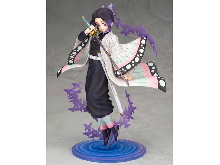 漫画、アニメで大人気の「鬼滅の刃」のメインキャラクター、胡蝶しのぶのフィギュアです。アニメを忠実に再現していて顔の表情は良く似ており、完成度が高いと思います。コスチュームも羽織のデザインが素晴らしく、グラデーションが非常に綺麗です。台座や蝶のエフェクトはクリアパーツが使われていて透明感があります。日輪刀も柄や鍔など細かい所まで丁寧に作られています。サイズは1/8 スケール、全高約22cmでちょうど良い大きさだと思います。
