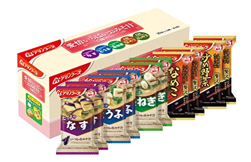 このセットには、5つの異なる味のおみそ汁が含まれていて、それぞれに独自の風味があります。 なす、とうふ、ねぎ、なめこ、炒め野菜の5種類です。 味を日替わりで食べる事も出来ていいと思いました。 このフリーズドライおみそ汁は、とても簡単に作れます。お湯を注ぐだけで、約10秒で飲むことができます。 5種類の味があるため、毎日同じ味のおみそ汁を飲むことに飽きた人にはおすすめです。 * 材料:「なす」:揚げなす(外国製造)、米みそ、調合みそ、ねぎ、風味調味料、でん粉・デキストリン混合物、みりん、乾燥わかめ、オニオンエキスパウダー、酵母エキスパウダー、こんぶエキスパウダー/調味料(アミノ酸等)、酸化防止剤(ビタミンE)、酸味料、(一部にさば・大豆・鶏肉・魚醤(魚介類)を含む)「とうふ」:豆腐(国内製造)、米みそ、調合みそ、ねぎ、風味調味料、乾燥わかめ、でん粉・デキストリン混合物、食塩、かつお節粉末、こんぶ粉末、酵母エキスパウダー/調味料(アミノ酸等)、安定剤(加工デンプン)、凝固剤、酸化防止剤(ビタミンE)、酸味料、(一部にさば・大豆・魚醤(魚介類)を含む) * 「長ねぎ」:米みそ(国内製造)、調合みそ、ねぎ、乾燥ねぎ、風味調味料、乾燥わかめ、かつおエキス、かつお節粉末、でん粉、こんぶ粉末/調味料(アミノ酸等)、酸化防止剤(ビタミンE)、酸味料、(一部にさば・大豆・魚醤(魚介類)を含む) * 「贅沢なめこ」:なめこ(国産)、調合みそ、豆みそ、みつば、風味調味料、しょうゆ、でん粉・デキストリン混合物、こんぶ、かにエキス、こんぶ粉末、かつお節粉末、酵母エキスパウダー/調味料(アミノ酸等)、カラメル色素、酸化防止剤(ビタミンE)、酸味料、(一部にかに・小麦・乳成分・さば・大豆・魚醤(魚介類)を含む) * 「贅沢炒め野菜」:キャベツ(国産)、米みそ、調合みそ、揚げなす、もやし、オニオンソテー、風味調味料、にんじん、みりん、でん粉・デキストリン混合物、ごま油、豚脂加工品、でん粉、香辛料、オニオンパウダー、香味油、酵母エキスパウダー/調味料(アミノ酸等)、酸化防止剤(ビタミンE、ビタミンC)、酸味料、香料、(一部に小麦・乳成分・ごま・さば・大豆・鶏肉・豚肉・魚醤(魚介類)を含む)