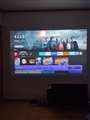 - 投写距離約1.1mで50型、約1.5mで70型の画面を投写できる小型レーザープロジェクター。斜め横からの投写でも補正可能。