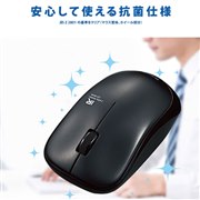 パソコンのマウス操作に安心をプラスする抗菌仕様のワイヤレスマウス。財団法人日本規格協会が定める抗菌性試験に準拠し、表面上における細菌の増殖を抑制するほか、阻害する性能を備える。