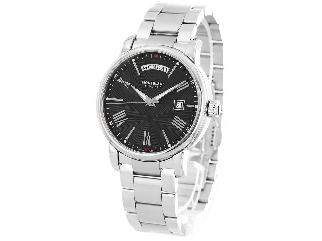 文字盤とリュウズがモンブランのロゴ模様で非常にかっこいい。 ステンレスの光沢に高級感を感じた。 また、デイデイトの機能がついている割にはとてもお手頃。