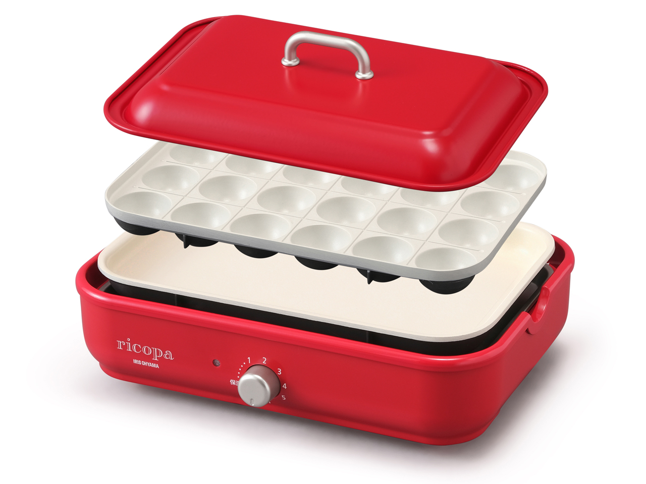 大きすぎず、小さすぎず、程よい大きさの ホットプレートなので、大活躍してくれています。 カラーはホワイト、レッド、グレーがあり、私は シックなグレーを選びました。光沢のある仕上げになっています。 火力の調整のダイヤルがあるので、操作はたったこれだけです。 目盛りには、保温と1から5まで数字が印字されています。 温度を表示したほうがわかりやすいかなと思いますが、 このホットプレートでは、1から5となっています。しかし、 何回か使えば、感覚的に温度調整はうまくできています。 平面プレートは深めなので、焼き物、炒め物はもちろん、 煮込み系もできますし、一度に24個焼けるたこ焼きプレート も付属されていているのが嬉しいです。