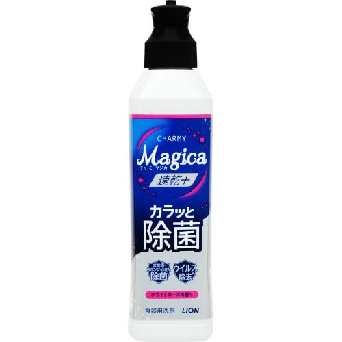 チャーミーマジカのシリーズはかなりいろんな商品を 使っており、こちらの商品も出ていたので購入しました。 中身は濃い水色の液体洗剤で、本体は四角のコンパクトで スリムなボトルなので収納しやすく、片手でとても持ちやすい ので使いやすいです。 また、本体ラッピングが水玉模様でなかなかお洒落なパッケージ なのでシンクが明るい雰囲気になるので良いと思います。 泡立ちはとても細かな泡が立ち、少量でもすっきり油汚れ等 綺麗に落とすことが出来ます。 香りはホワイトローズとのことですが、小菊と新鮮なバラをかけ あわせたようなフレッシュな香りで良く、いろんなメーカーから 台所用洗剤は出ていますが、ホワイトローズの香りは他でもなかなか 出ていないので、香りにこだわりがある方には特に良いと思います。 この商品は泡切れだけでなく、水切れが洗ってる途中もとても良く だから速乾にも繋がっていると思います。 また、これで除菌も出来るので台所スポンジがよく変色してしまう ことがあるのでこれでこまめに除菌するようにしています。