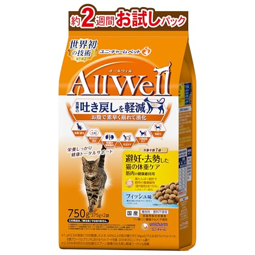 AllWell 避妊・去勢した猫の体重ケア 筋肉の健康維持用 フィッシュ味 挽き小魚とささみフリーズドライパウダー入り 750g(375g×2袋)
