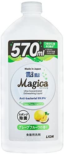 チャーミーマジカの新しい商品が発売される度にいろいろと 使っており、こちらも比較的新しい商品で本体の中身が空に なったのでこちらの詰め替え用も購入しました。 この詰め替え用は一本で本体に約3回分使えるので、本体を 持っていればこちらの方が断然お買い得なので買いました。 酵素が汚れを分解してくれるということなのですが、普通に 食器を洗う分には少量で綺麗に汚れが落ちてすっきりと洗う ことが出来ています。 また、魚の網焼き器の使ったものや煮込んだ鍋、油を使った フライパン等は水を張ってこの洗剤を少し入れて付け置きして おけば、特に油汚れは簡単に落ちており、洗った後の食器等も ぬるっとした感覚等一切なく綺麗に洗えています。 グレープフルーツの香りは洗剤のこういう柑橘系の中でも甘ったる くなくレモンの次にすっきりとした嫌みの無い香りでとても使い やすかったです。 このシリーズは本当に価格が安くて使いやすく、ネットで簡単に 買うことが出来るのでとても重宝しています。