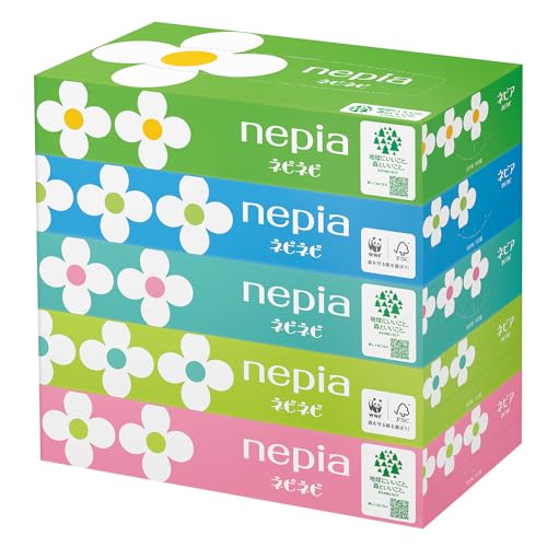 ネピアのティッシュです! 5箱セットですが今回写真では…ではひと箱のみ… ネピアの商品なのでなんとなく安心して使うことができました。 箱は5色で色分けされていますがシンプルなお花模様がとても可愛らしいです! スリムな箱に入っているのでケースに収納しやすくコンパクトで置き場所に困りません。 中身は普通のティッシュといったらおかしいですが普段使うのにぴったりな感じのティッシュペーパーだと思いました。 ローションティッシュのような柔らかさはないですがガサガサとしているわけではないので肌荒れを起こしたりそういったことはありませんでした。
