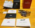 | 主な付属品と共に。化粧箱は全て紙製となっています。 | 値段の割にはブレスレットやケースの造り込みも良いと思います。 | グレー・カラーのダイアルは、光に当たると放射状に輝くサンレイ仕上げです。 | 私の手首周りは15.5cmですが、装着画像はこの様になります。 |