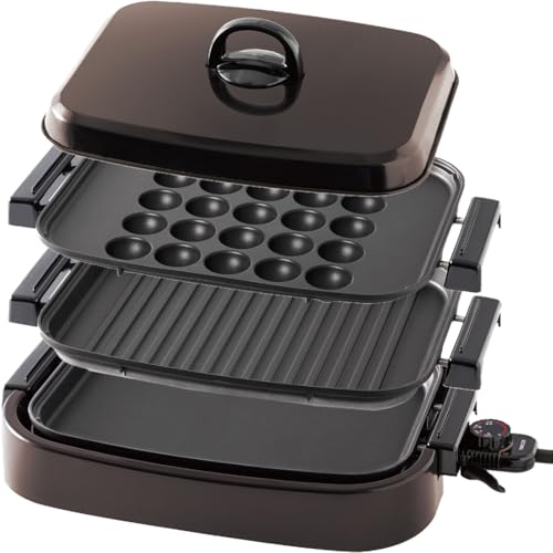 多くの人がホットプレートと聞いて想像するだろう典型的な 機能と形状の製品なので飽きがこなくて長く使える製品。 プレートは3種類 たこ焼き、波型、平板形状。 プレート交換式で特に止め方に変わりはなくて本体部のヒーターに 載せているだけなので持ち上げるだけで交換可能。 さらにプレートには持ち手が付けてあるので完全に冷めるまで 待つ必要がなくて安全いもてるのは良い所。 ヒーター能力も1300Wと必要十分のパワー フタ付き