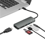 ノートパソコンなどの端末とUSB Type-Cで接続できるドッキングステーション。HDMIポート、USB 2.0 Aポート、USB 3.1 Gen1 Aポートをそれぞれ1ポートずつと、SDカードスロット、microSDカードスロット搭載する。