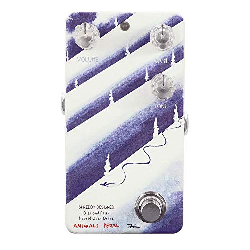 Animals Pedalが現在のスタイルの筐体となった最初のモデルが、このDiamond Peak Hybrid Over Driveです。 ヴィンテージトーンに高いこだわりを持ち、同時にSMD(表面実装)パーツとスルーホールパーツの違いにも詳しく、それぞれに合わせたハイレベルな設計が行われたペダルです。 設計はSkreddy Pedals。どちらかといえばファズのイメージが強いSkreddy Pedalsですが、同ブランドのSkrew Driverをはじめ、オーバードライブサウンドにも定評があります。 Diamond Peak Hybrid Over Driveは、ブリティッシュアンプ、プレキシサウンドのローゲインペダルです。 プレキシといえば60年代を代表するロックサウンドで、JTMやSuper Leadなどの歪みがフィーチャーされやすいですが、このペダルはよりローゲインな、クリーンと歪みの中間的なサウンドを作ることができます。 ブースター的に使うことはもちろん、常時ONでプリアンプのように使ったり、逆にゲインを高くしてミドルオーバードライブとして使ったりできます。 レスポンスが高く、アンプのように広い周波数のサウンドを出力するオーバードライブです。冬山をスキーしているようなデザインですが、その凛とした冷たい空気の中を響くような、透き通った歪みが特徴です。 60年代のマーシャルアンプはそれほど強くは歪みませんでした。そのため、多くのギタリストがトレブルブースターやファズなどを使用し、強い歪みを作っていました。 そんな時代の、アンプをフルアップから少し下げた程度のような歪み方をするペダルです。 プレキシ系やブリティッシュ系と言われるエフェクターは多くありますが、この絶妙なゲインレンジのペダルは意外と珍しいかもしれません。 各コントロールノブもシンプルで扱いやすく、それでいてこのペダル特有の音色と使い方ができる、幅広くヴァーサタイルなペダルでありながら個性も併せ持った、使えば使うほど奥が深いペダルです。