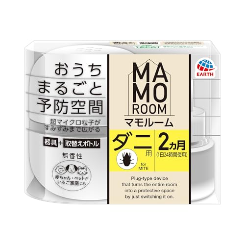 【効果】 中国製のパソコンチェアーを購入したところ、ダニが発生しました。 このマモルームをセットして1週間ほど様子を見ましたが、 それほど効果がありませんでした。 ダニアーススプレーで直接椅子に噴霧してからは発生しなくなりました。 単体では退治することはできないようで、予防効果しかなさそうです。 【使いやすさ】 コンセントに挿してスイッチを押すだけの簡単操作です。 電源の表示LEDがスイッチと90度ずれていて確認がしにくいです。 薬剤の残量確認の窓があるのですが、非常に見にくいです。 中が暗いし、薬のボトルの小窓も細くて中が確認できません。 【耐久性】 2か月用のセットでしたが、寝室で夜付けておくのはやだったので、 昼間は寝室、夜はリビングでほとんど付けっぱなしという状況でした。 表示の通り約2か月でなくなりました。 【総評】 ゴキブリ用と蚊用と共通の本体で、薬のボトルを交換すれば、 使いまわしが出来て便利だと思います。 臭いもほとんどせず、気になりません。 即効性はないので、スプレーと併用する必要があります。 長時間付けておくことて発生防止になるようです。