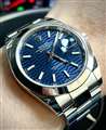 【デザイン】ブライトブルーのフルーテッドモチーフダイヤルは見る角度や光の当たり方で表情を変える複雑な美しさで、シンプルなスムースベゼル&オイスターブレスとの組み合わせが非常に秀逸です。エレガントとスポ...続きを読む