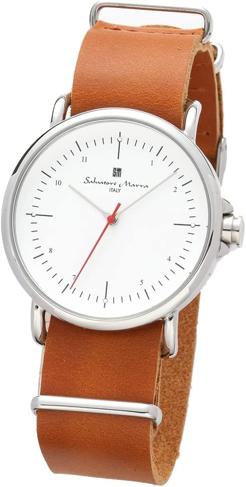 Salvatore Marra(サルバトーレマーラ)。 2009年から日本で展開されているイタリアンテイストの腕時計ブランド。 「SM22104」シリーズはレザーのNATOベルトを採用したシンプルな3針クォーツ。 5色展開。 SM22104-SSWH。 本モデルはシルバー×ホワイトのモデル。 SSケースにホワイト文字板。 安心感のあるオーソドックスなカラー。 細い3針の無駄を削ぎ落としたシンプルなデザイン。 レッドの秒針がさり気ない差し色になり可愛い。 ホワイトの細い長針、短針はホワイトの文字板上での視認性が悪い。 ケース径39mm、厚さ8.2mmで腕元で丁度良い使いやすいサイズ感。 NATOベルトは可愛さも感じるライトブラウン。 NATOベルトはビジネスシーンではやや使いにくい。 風防はミネラルクリスタルガラス。 3気圧防水。 27,500円(税2,500円)。