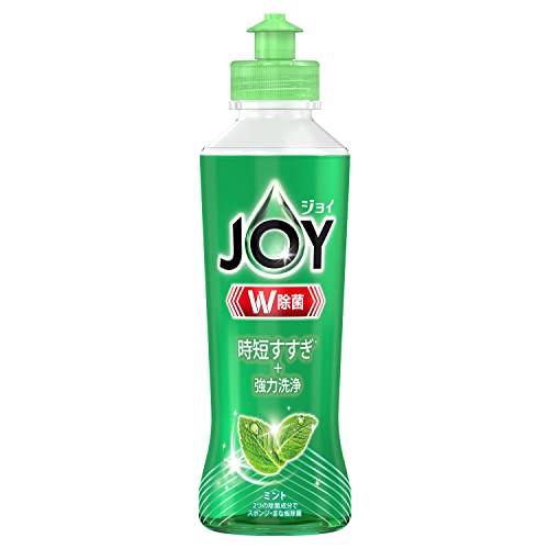 ジョイから出ているこのキッチン用洗剤を購入しました。 170ml入りのボトルでちょうどボトルを持つ部分が細く なっているので、水で濡れている手でこの洗剤を掴んでも 滑りにくくて良く、170ml入りなのでややコンパクトな形状 でした。 ミントらしいグリーンの透明がかった洗剤で、少量で何枚でも 食器を洗えるので経済的でした。 また、少量で適度に泡立って洗えるのですすぎがとても楽で 簡単にすすぐことが出来るので食器洗いの時間を確かに短縮は 出来ていると思います。 泡切れが良く、価格も安くて使い勝手はかなり良かったです。