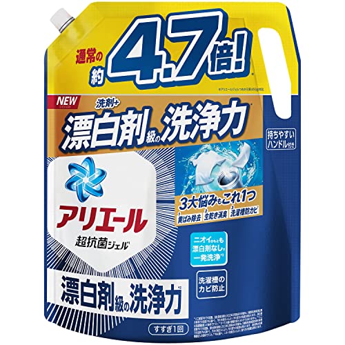 通常の4.7倍の容量。超ウルトラジャンボサイズです。 容量が容量だけにパッケージに持ち手があり、持ち運びにも便利だと思います。 また、容量が容量なので一人暮らしの私なら半年はらくらく持つ容量だと思います。 漂白剤並の洗浄力と謳っていますが、ややオーバー気味な表現かも知れませんが、洗浄力は中々の能力だと思います。 黄ばみに対しても中々効果があると思いますが、あまりしつこいやつなら黄ばみの所に直接掛けて手洗いして洗濯したら、結構落ちました。
