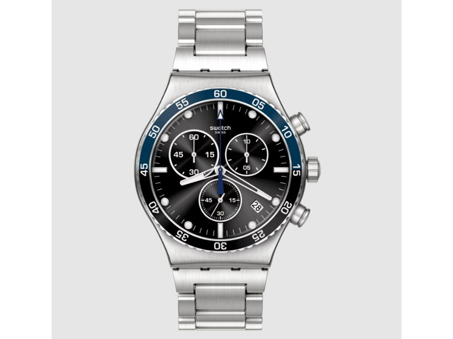 スウォッチグループ内の一般層向けのリーズナブルな時計を展開するブランド。 ブランド名「Swatch」の由来は「Second Watch」(=第二の時計)。 ブランド立ち上げは1983年。 DARK BLUE IRONY(YVS507G)。 ケースサイズ43.0mm。 ケース厚12.67mm。 クォーツ式。 3気圧防水。 ステンレスケース。 ステンレスブレスレット。 文字板のブラックにベゼルのブルー。 落ち着いたブラックに清潔感のあるブルーの配色が格好いい3つめのクロノグラフ。 サンレイ仕上げによる美しい放射状紋様は見えポイント。 ステンレスケース、ステンレススティールブレスのIRONYモデルでブラッシュ仕上げによる艶を抑えたマットな質感は落ち着きがあり高見えする。 43.0mm径、厚さ12.67mmで腕元でクロノグラフとしての良い感じの存在感を放ってくれる。 30,800円。
