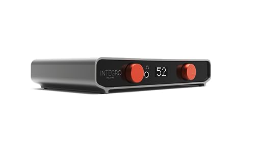 - 電子回路は非磁性アルミニウムの筐体に包まれ、2つのオレンジ色のノブでボリュームのコントロールや入力の選択ができる。