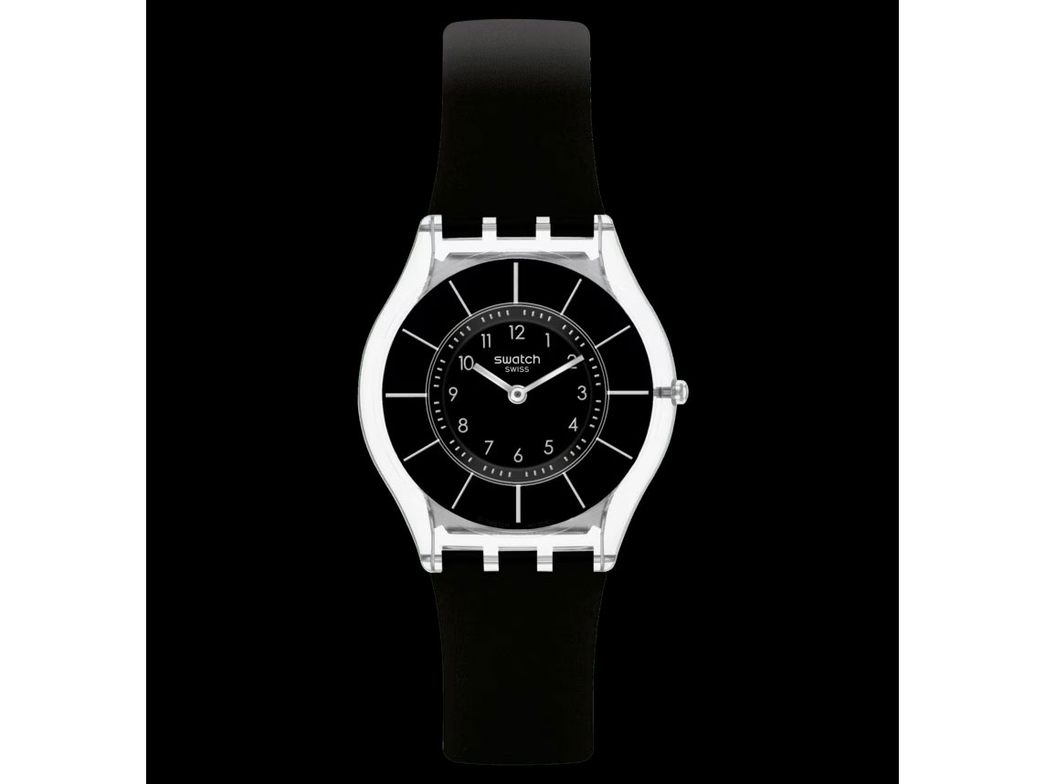 BLACK CLASSINESS(SS08K103)。 ブラック基調の34mm径、4.3mm厚のスタイリッシュなスウォッチ。 ブラックの文字盤は外周にシルバーのスリムなインデックスのリング、中心にはシルバーのアラビア数字インデックスのリング。 特徴的なデザイン。 透明のケースがブラックの重厚さを軽やかなものにしている。 2針でシンプルでエレガント。 34mmと小ぶりなサイズでストラップも細身。 ケース厚は4.3mmで超薄型。 エレガントさを感じるデザインだがバイオ由来素材のケース&ストラップの質感は価格なり。 3気圧防水。 17,600円。