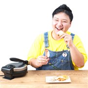 まるごとのタコや海老など魚介や、おにぎりなどの食材でパリパリのせんべいを作れるプレス機。本体プレートの上にプレスしたい直径8cm以下、厚さ3cm以下の食材をのせ、上部分のプレートを閉じて上部のハンドルで上から圧力をかけると、約30秒でせんべいができあがるという。
